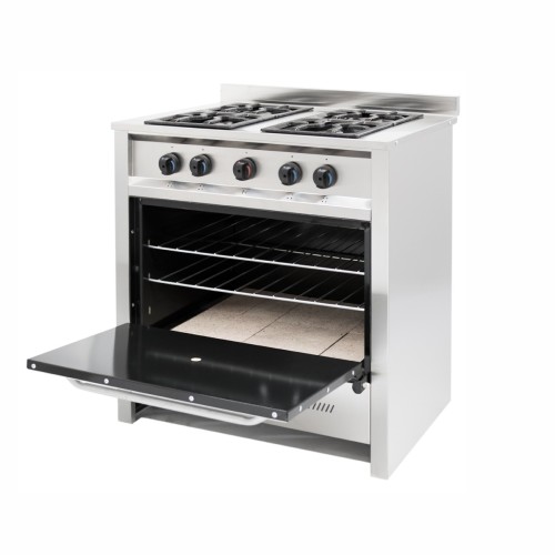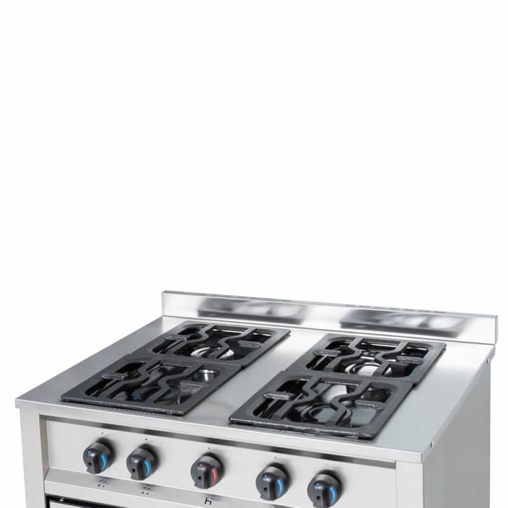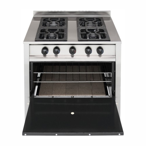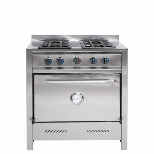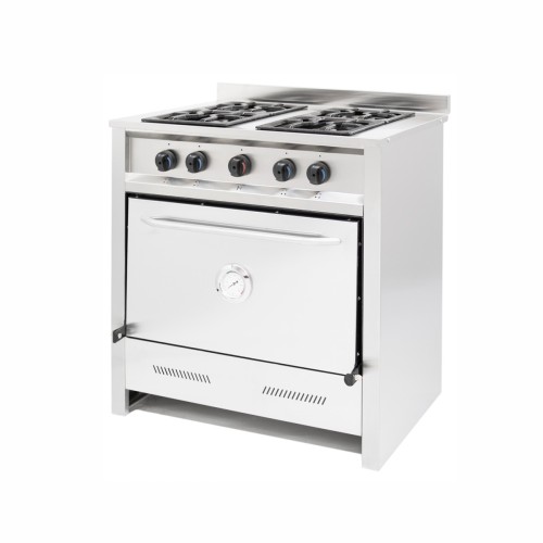 Horno: Plano de cocción con rejillas de hierro desmontables, Quemadores de aluminio con tapa enlozada, Robinetes multigas aptos gas natural o envasado, Horno con aislación de lana de vidrio fl 50 ignifuga, Quemador de horno tubular, Horno con válvula de seguridad contra apagado de llama, Bandeja antiderrame enlozada removible para fácil limpieza, Horno enlozado con rejillas móviles y piso refractario, Pirómetro indicador de temperatura de horno bimetálico.